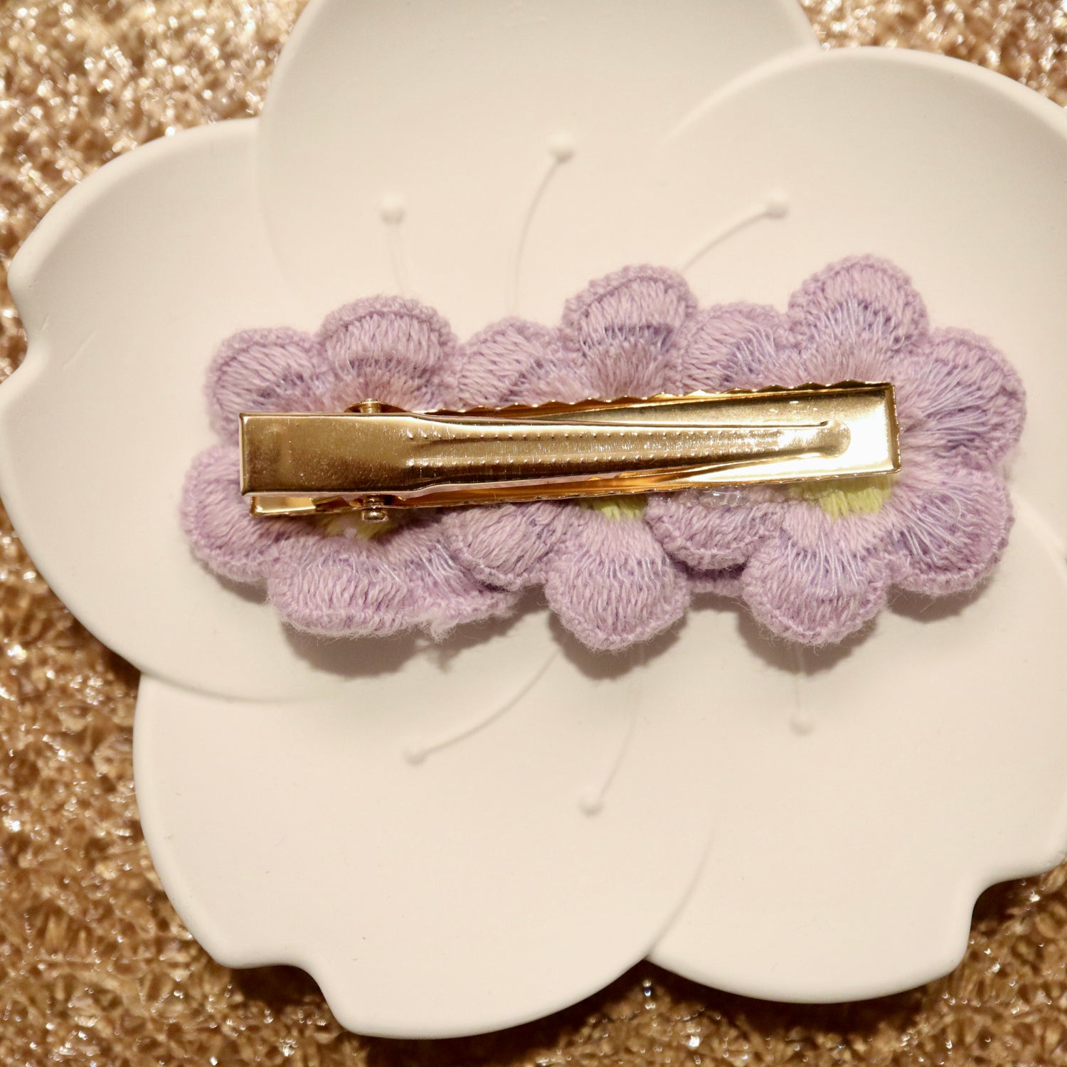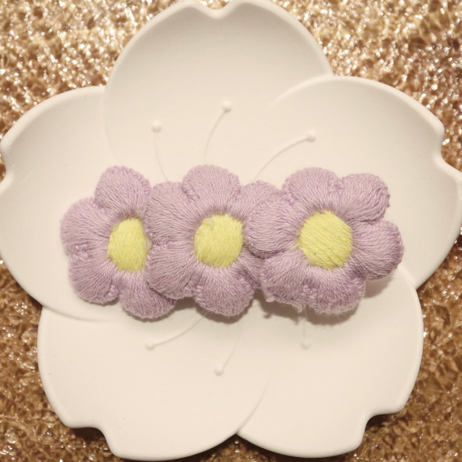3朵刺繡花,淡紫色配黃色帶有青春氣息,任何季節都可以配襯造型。