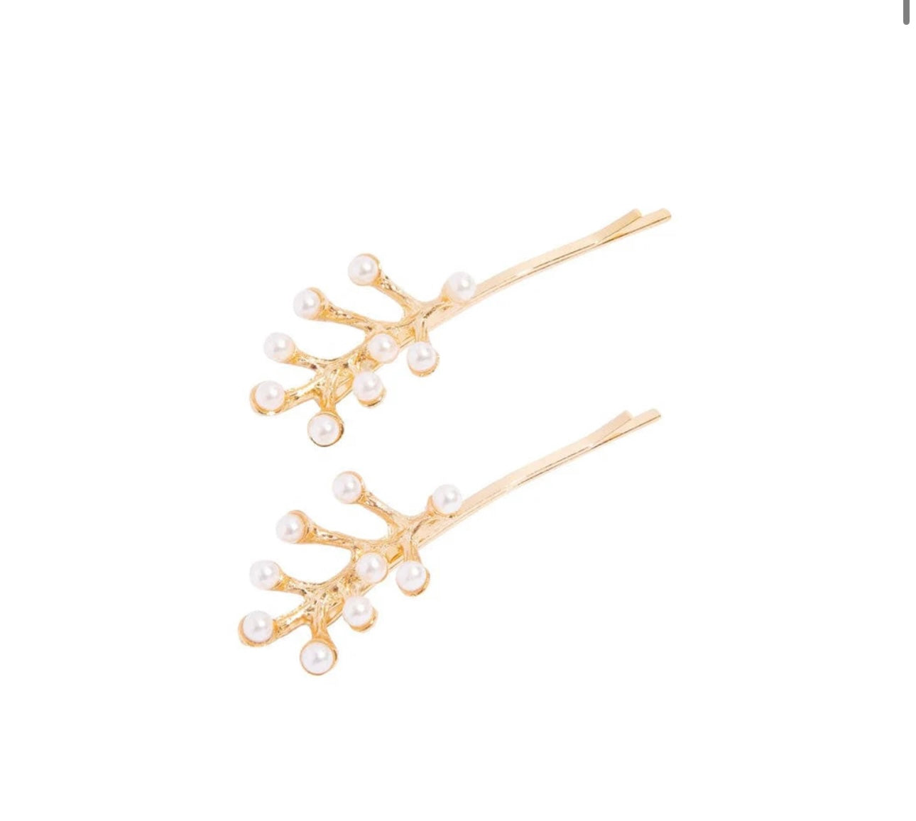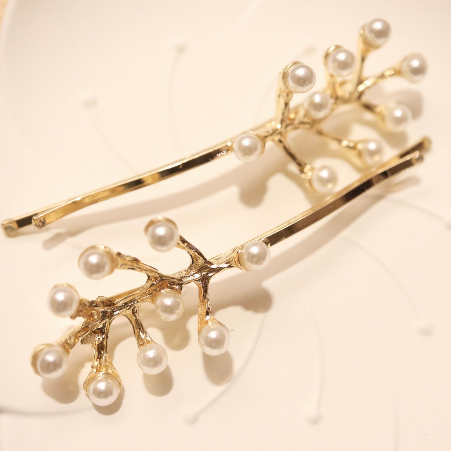 一顆顆珍珠依附在髮夾上,並形成葉子形狀。一套兩件裝